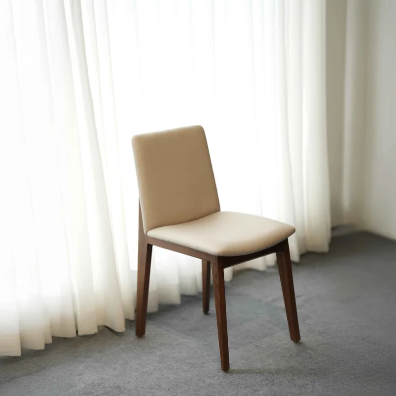 The DFT C Dining Chair features a sturdy wooden frame paired with a comfortable fabric seat, blending natural elegance with everyday functionality.