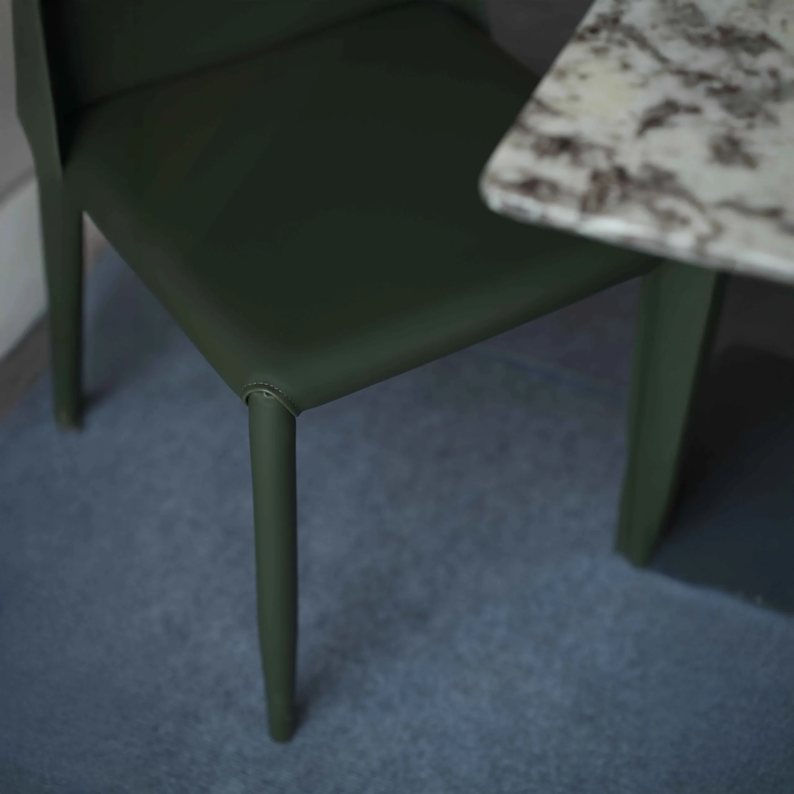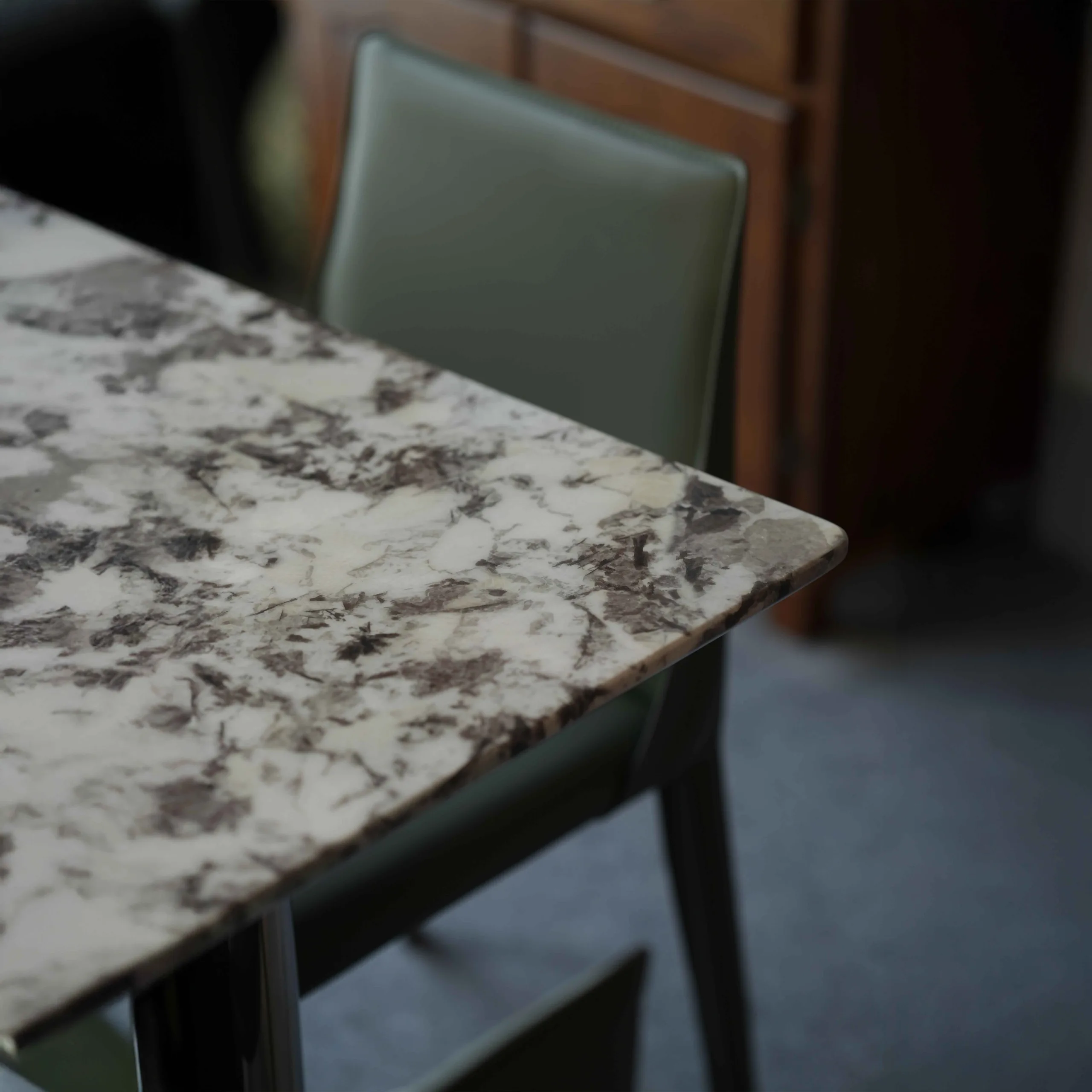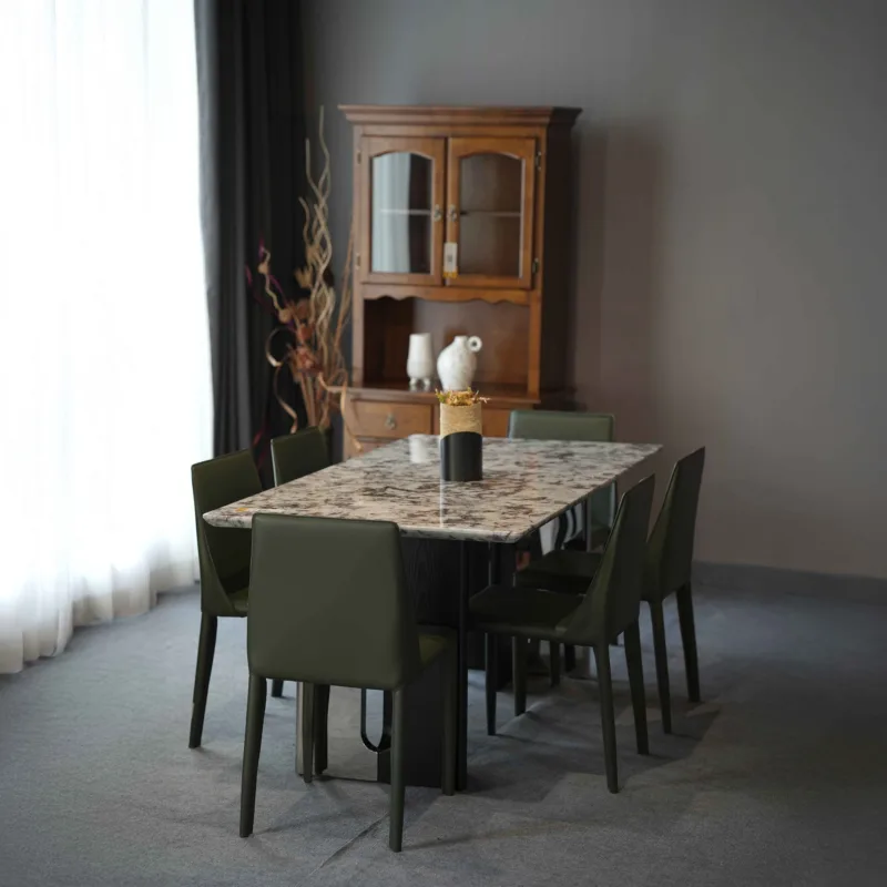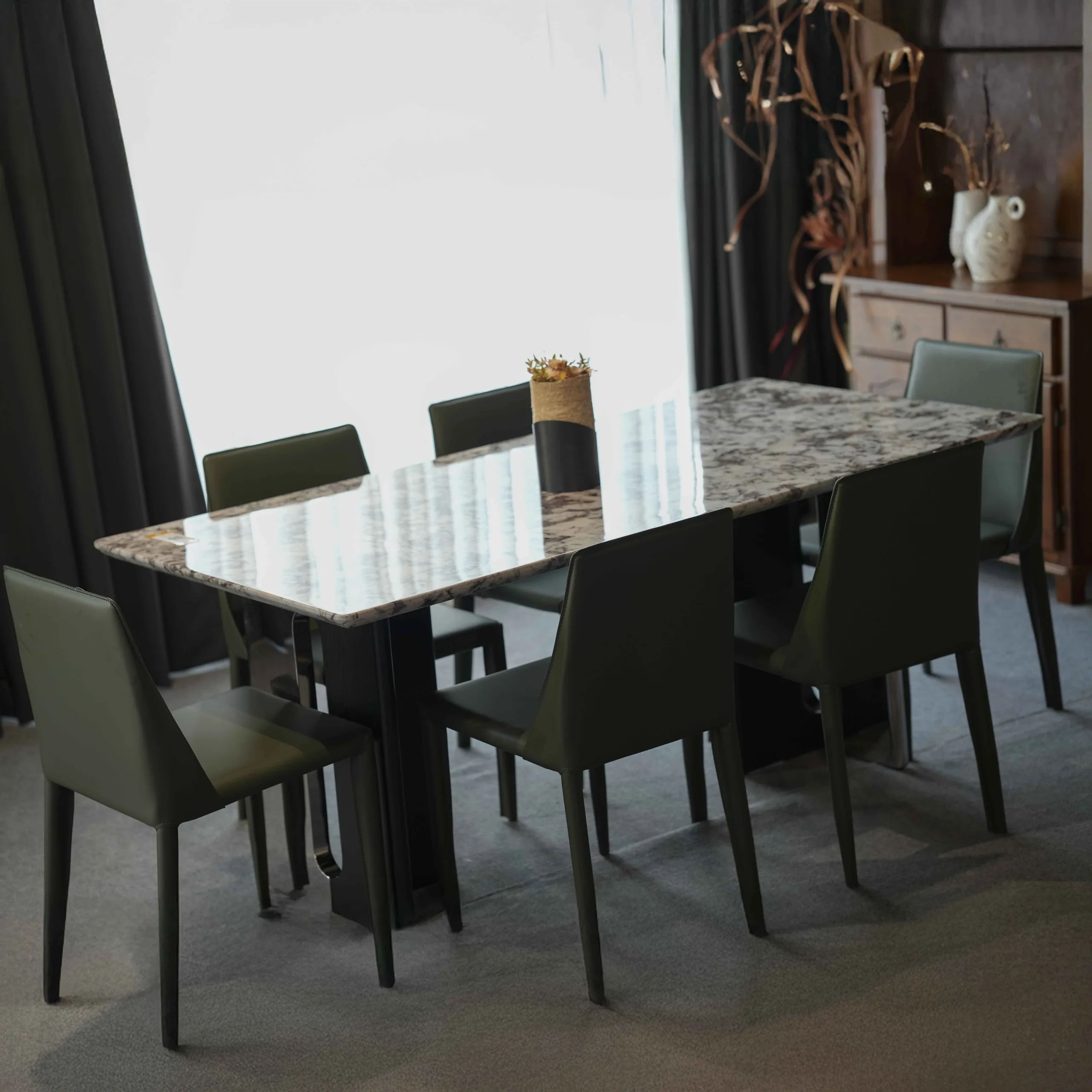 The AK8 Dining Table pairs a solid wooden base with a premium marble top, offering both durability and elegance.