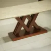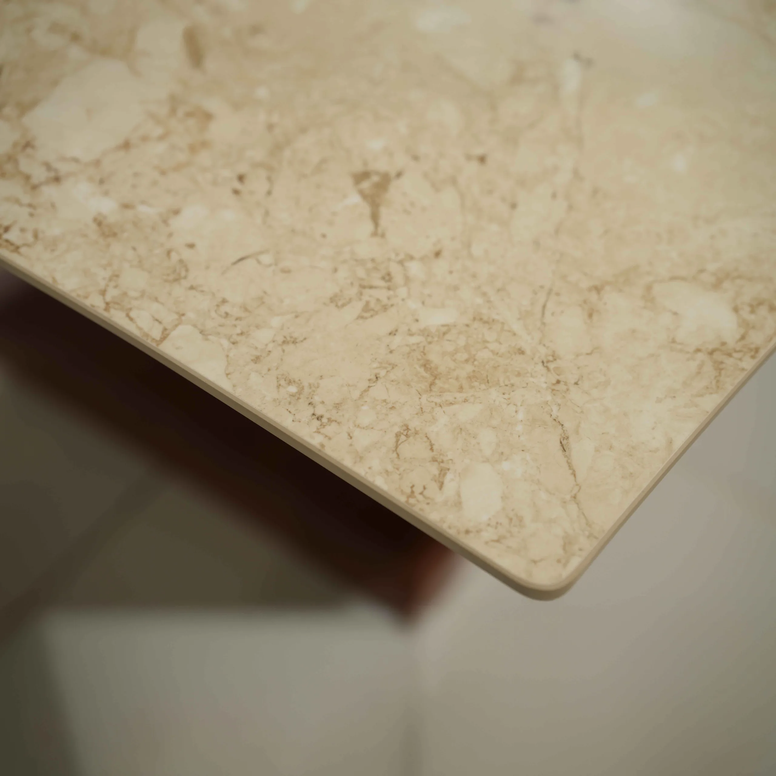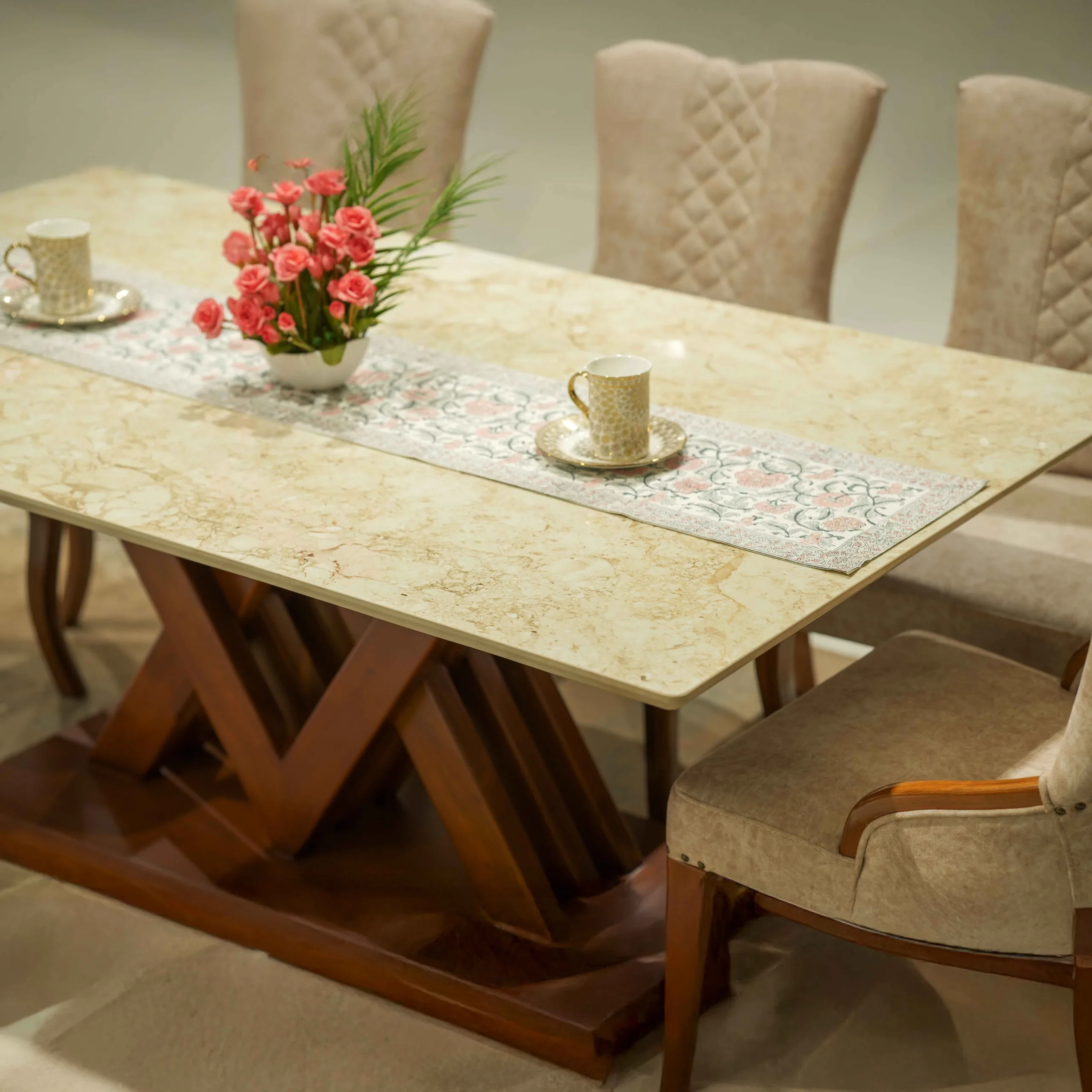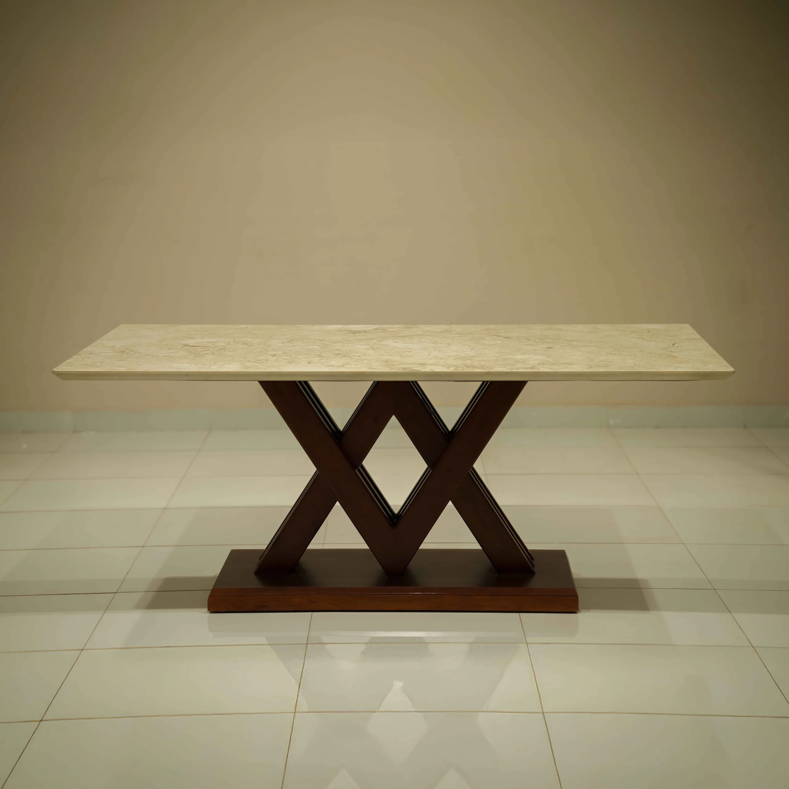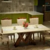 The VDT V Dining Table blends a sturdy wooden base with a luxurious marble top, offering both durability and elegance.