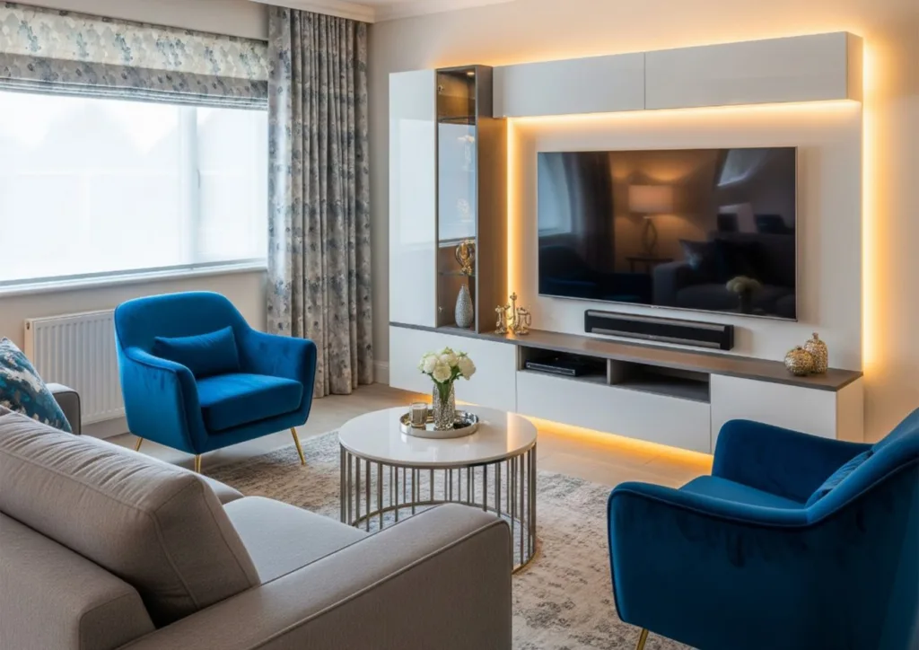When your TV is the main feature, angle your sofa and chairs for the best view. Keep furniture low-profile or opt for open shelving around your TV unit so the room feels spacious and airy.